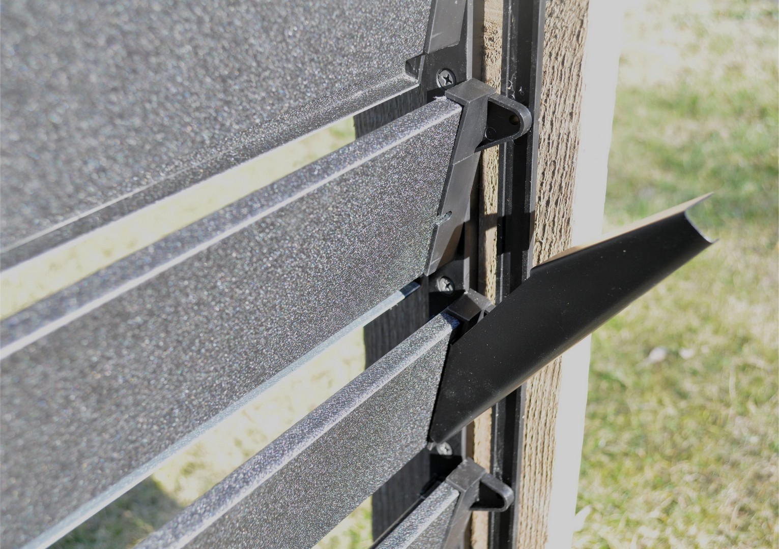 Uchwyt, rączka do sterowania żaluzjami tarasowymi. Umożliwia ich łatwe zamykanie i otwieranie. Wykonane w blachy stalowej, malowane proszkowo, kolor czarny półmat. Montaż bezpośrednio do spodu drewnianej żaluzji, w komplecie 2 wkręty montażowe.